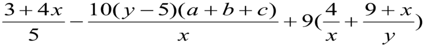 (3 + 4 * x) / 5 – 10 * (y - 5) * (a + b + c) / x +\